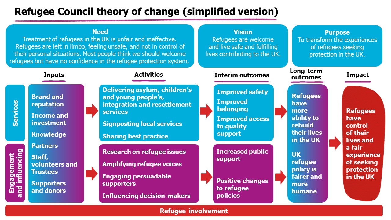The full version of our theory of change has a lot of detail so we created a simpler version to make it easier for everyone that we work with to see how we help to deliver impact with refugees.