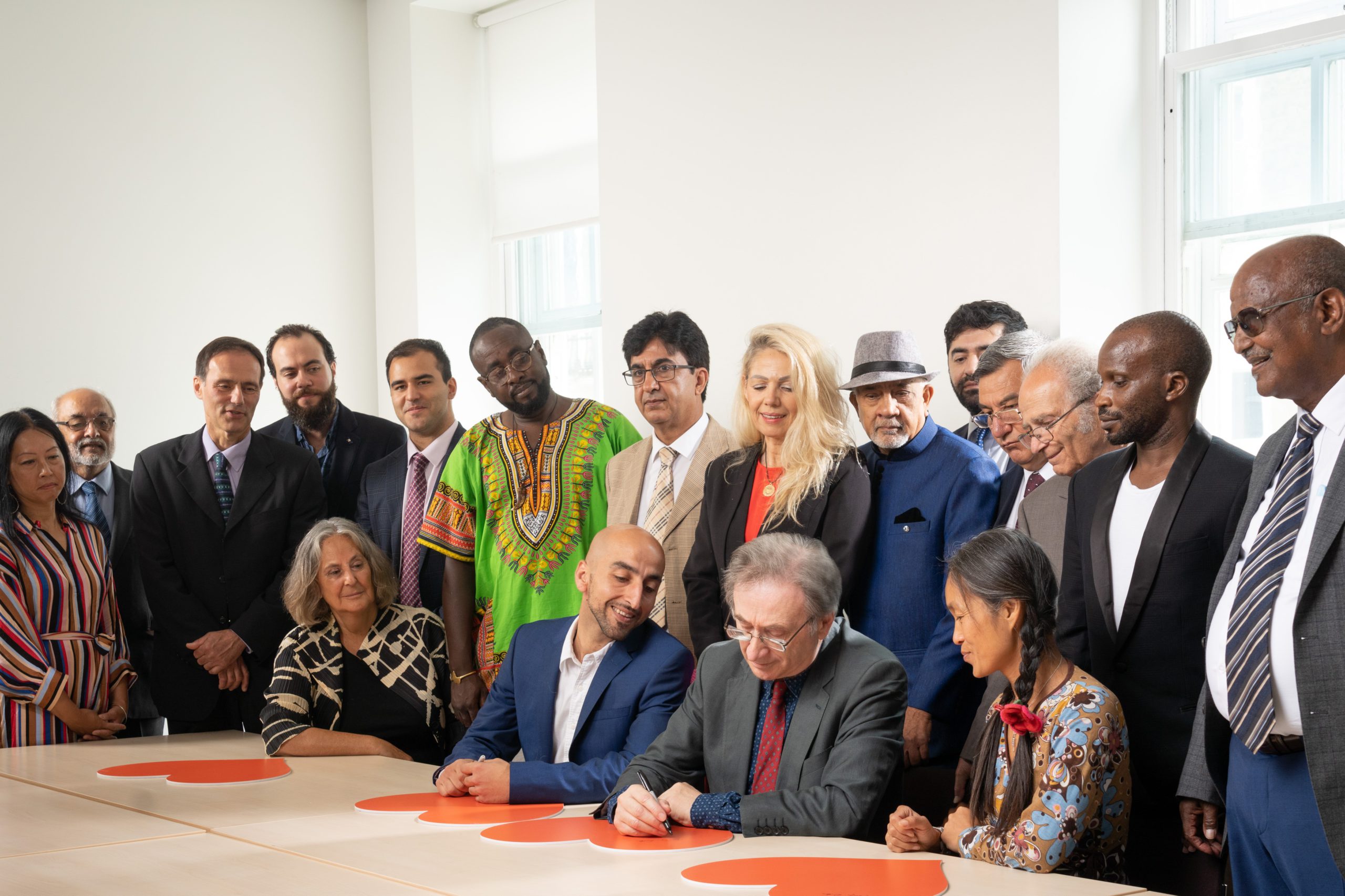 The photograph, created by coalition campaign Together With Refugees, brings together refugees spanning recent history: from dissident writers escaping communism in the 1950s to Syrian families fleeing war today, alongside Ugandan Asians who fled the tyranny of Idi Amin and people who escaped ethnic cleansing in the Balkans. In the place of the UN document, they signed an orange heart, a symbol of support for refugees.